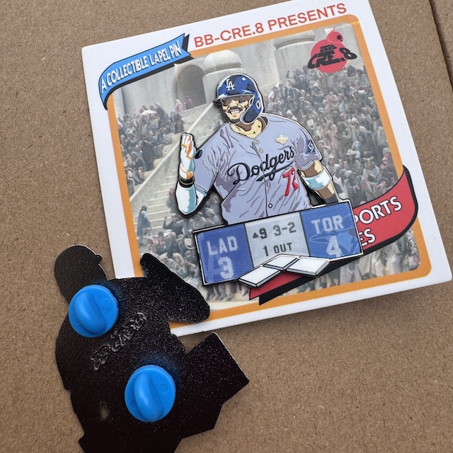 WHAT A WORLD SERIES! Game 7.. everything was tight, every pitch heavy. The Boys in Blue down 1 with 1 out at the top of the 9th inning... Miggy steps up to the plate... and he's usually not the superstar headliner name... he's just a dude with great work ethic, amazing team moral, and would be considered the glue of the team. He steps up to the plate... he does whatever he could to stay alive at the plate. Now we're at 3 balls, 2 strikes... tension building. The pitcher misses his spot... and then... CRACK! The ball goes way back... back... back more... HOMERUN! MIGGY ROJAS DID THE IMPOSSIBLE AND TIED THE GAME! If you're a fan, that moment stays with you forever with the roar, the hope, the feeling that baseball, just for a second was pure bliss. And your Best Buds wanted to celebrate that very moment with our newest tribute to our MVP of that game as BB-CRE.8 proudly presents GAMECHANGER MIGGY (LENTICULAR PIN)!